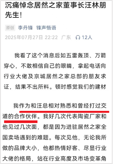 自称与汪林朋相对熟悉、打过交道且是合作伙伴的某建材公司前高管李丹锋求证后,发文“沉痛悼念”。